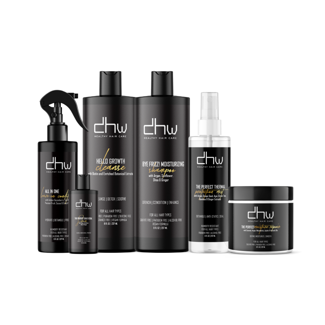 • Hello Growth Cleanse • Bye Frizz Moisturizing Shampoo • All-In-One Leave-In Conditioner • The Perfect Thermal Protection Mist • The Perfect Moisture Repair Mask • The Perfect Silk & Seal Serum